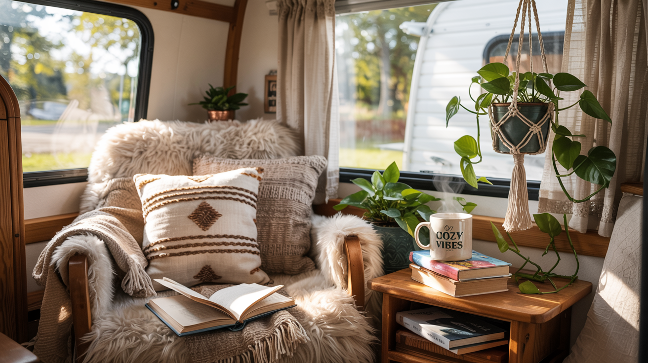 These RV organization hacks blend storage with decor beautifully, adding texture and warmth to your boho camper interior.