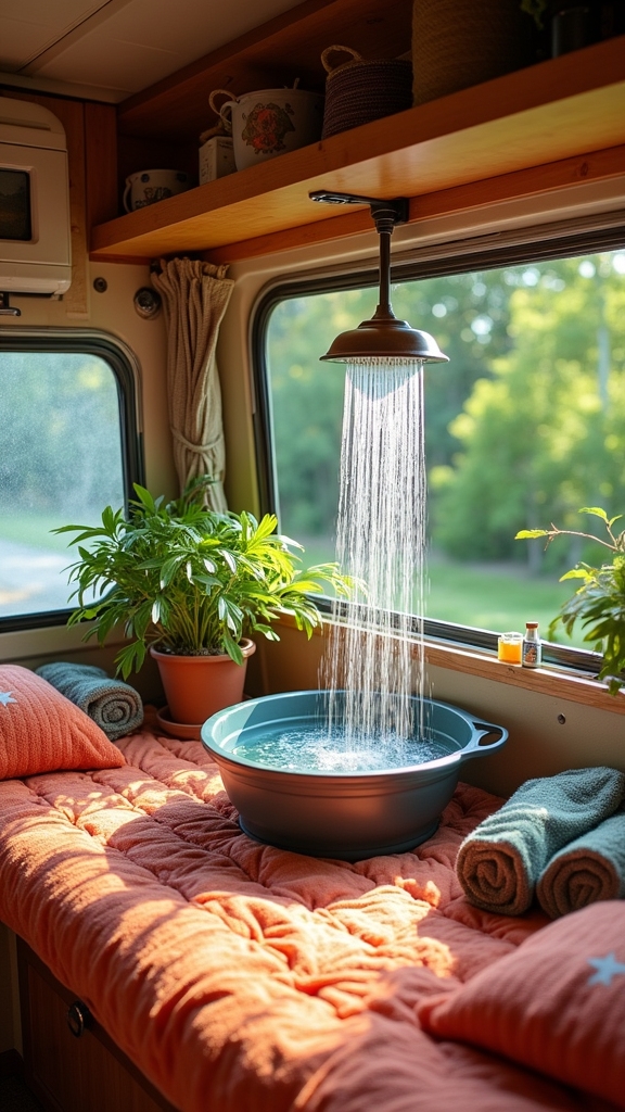 Consider using a portable shower with a water container, or take advantage of public showers at truck stops and gyms.