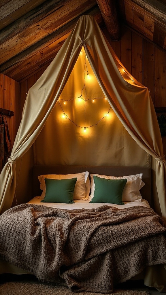 Your forest-themed accent wall sets the stage for the ultimate camping bedroom centerpiece: a tent-style canopy bed that transforms your sleeping space into an adventurous retreat.