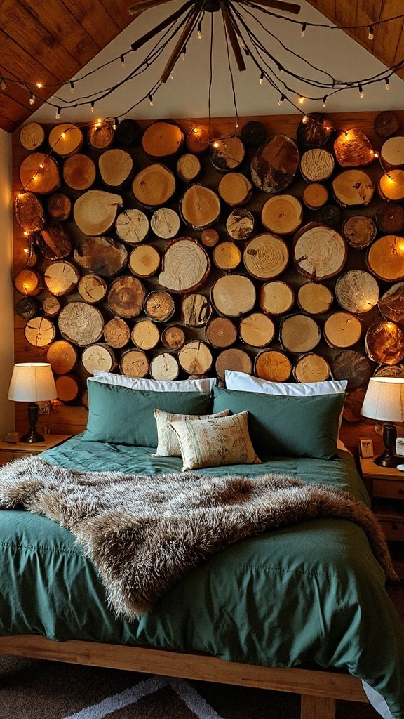 Rustic wooden log slices bring the raw beauty of nature directly onto your bedroom walls, creating an authentic camping atmosphere that’ll make you feel connected to the outdoors.