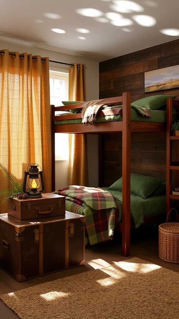 Beyond soft textiles, vintage camp trunks offer practical storage that reinforces your bedroom’s outdoor aesthetic.