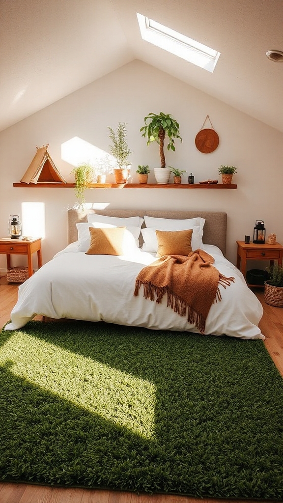 You’ll instantly create a natural foundation for your camping-themed bedroom by placing green grass-effect rugs in strategic zones throughout the space.