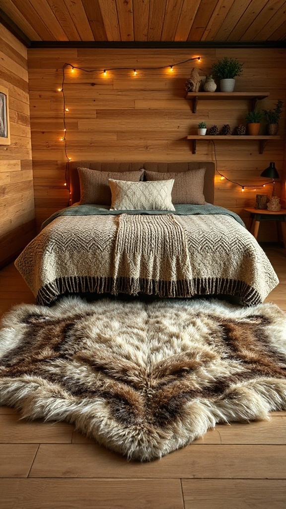 Transform your camping-themed bedroom into a cozy retreat by layering faux fur and knit throw blankets across beds, chairs, and benches.