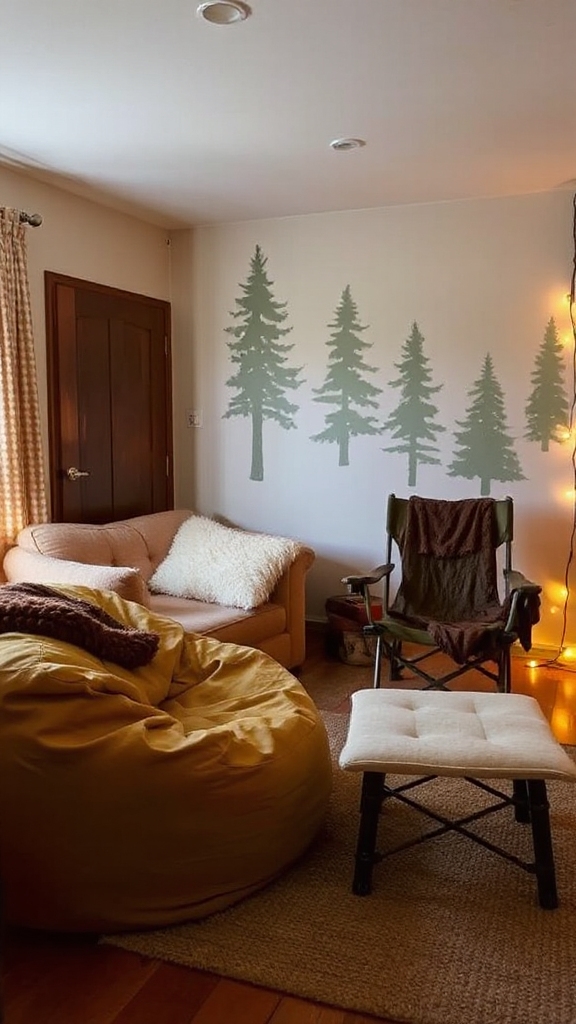 Transform your camping-themed bedroom into a versatile retreat by incorporating bean bags and vintage lawn chairs that capture the casual spirit of outdoor living.