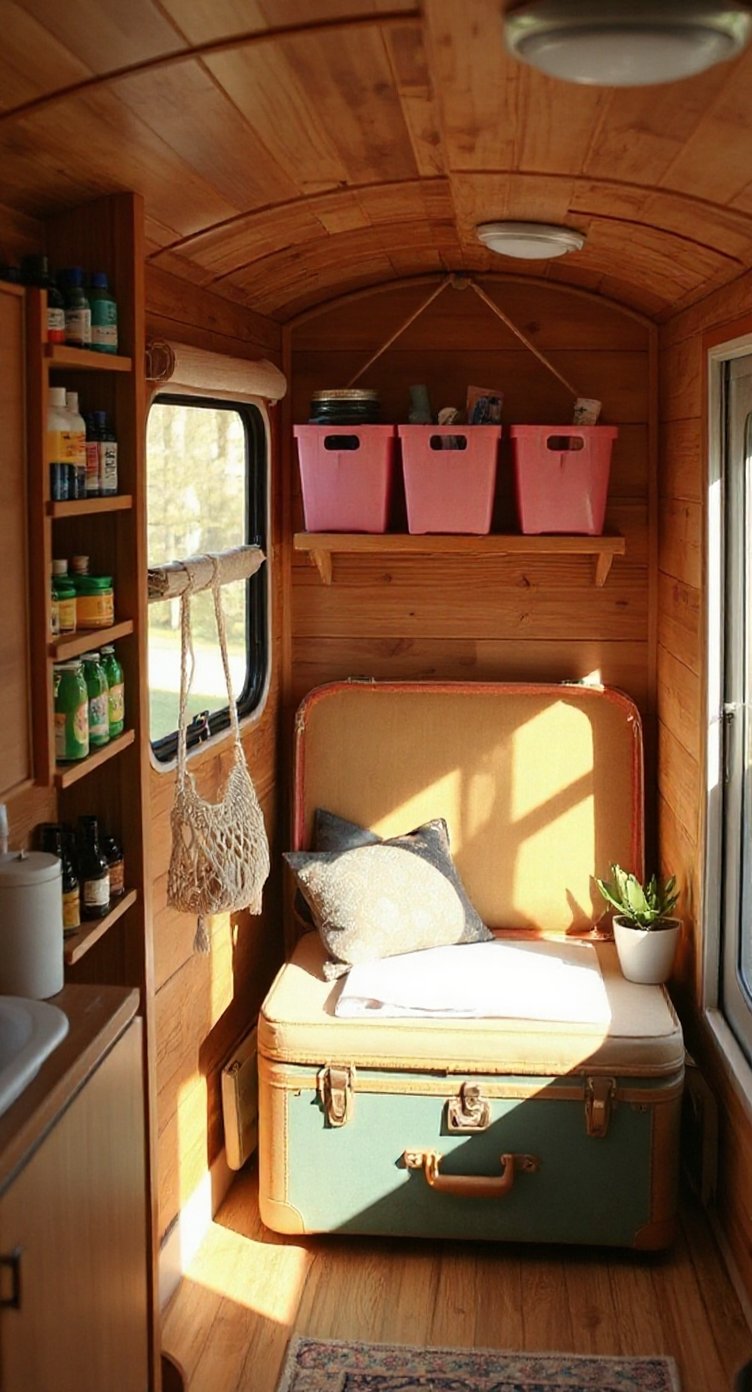 Consider using clear, stackable containers for cabinets, and utilize under-seating storage for outdoor gear.