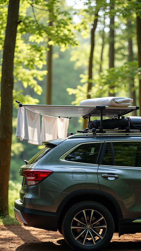 A versatile car-mount drying rack transforms your vehicle into a practical laundry solution during camping trips.