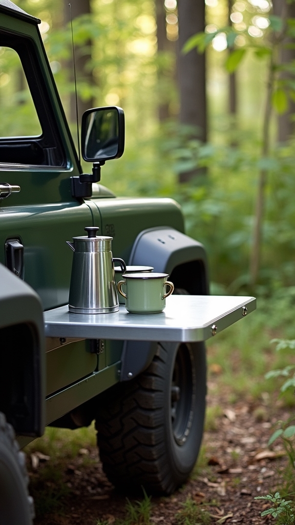 Modern fold-down camp tables provide essential workspace for cooking, dining, and gear organization during outdoor adventures.