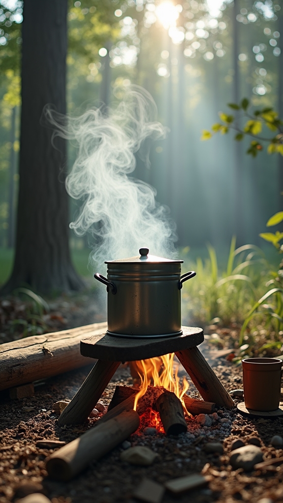 You’ll get great results using the cowboy coffee method by adding grounds directly to boiled water, letting them steep for 4-5 minutes, then carefully pouring to leave sediment behind. Pre-heated water stored in a well-insulated thermos can provide hot coffee without needing a fire or stove.