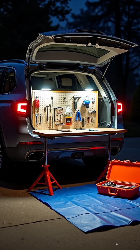Preparing for vehicle emergencies during camping trips requires establishing a well-organized car repair station with essential tools and safety equipment.