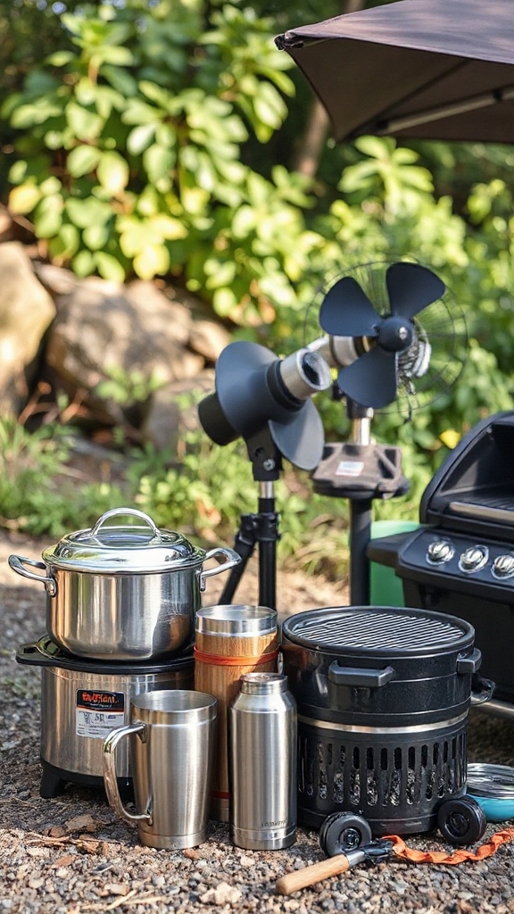 You’ll want to invest in a portable propane stove or induction cooktop for controlled cooking, and consider thermal cooking containers that don’t generate excess heat. Set up your cooking station in a shaded area and use heat-resistant gloves for safety.