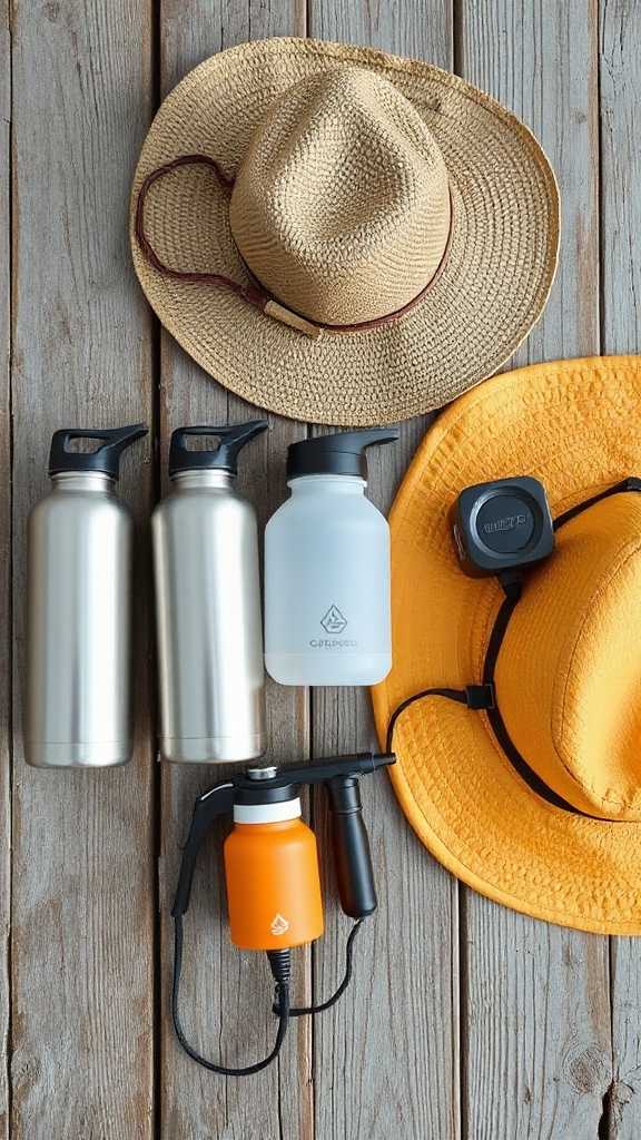 Don’t forget insulated water bottles, cooling towels, and electrolyte replacements to maintain safe body temperature during your outdoor adventures.