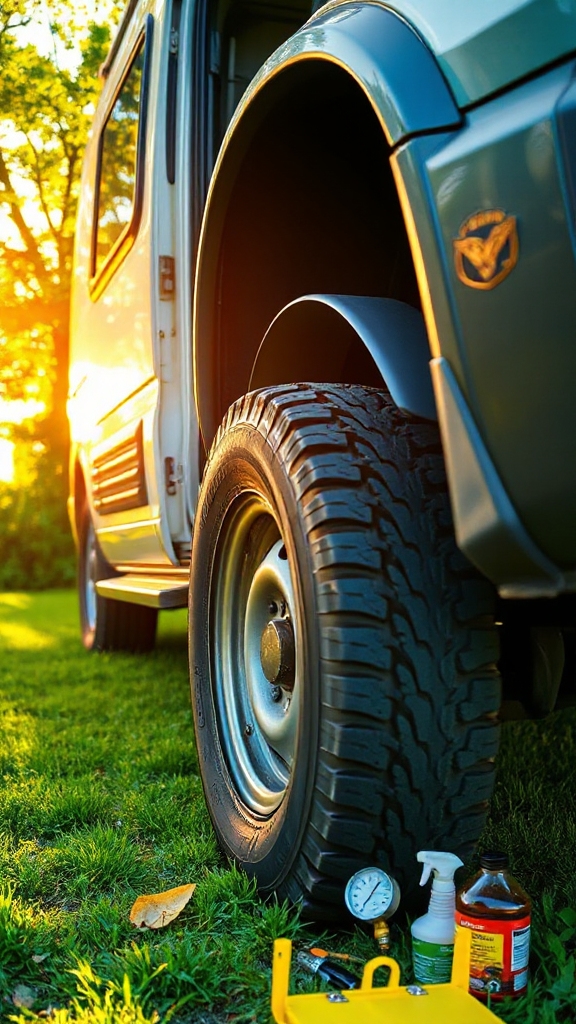 Check each tire’s tread depth using a gauge or penny test, aiming for at least 4/32 inch of depth. Inspect sidewalls for cracks or bulges, and don’t forget to examine valve stems for damage.