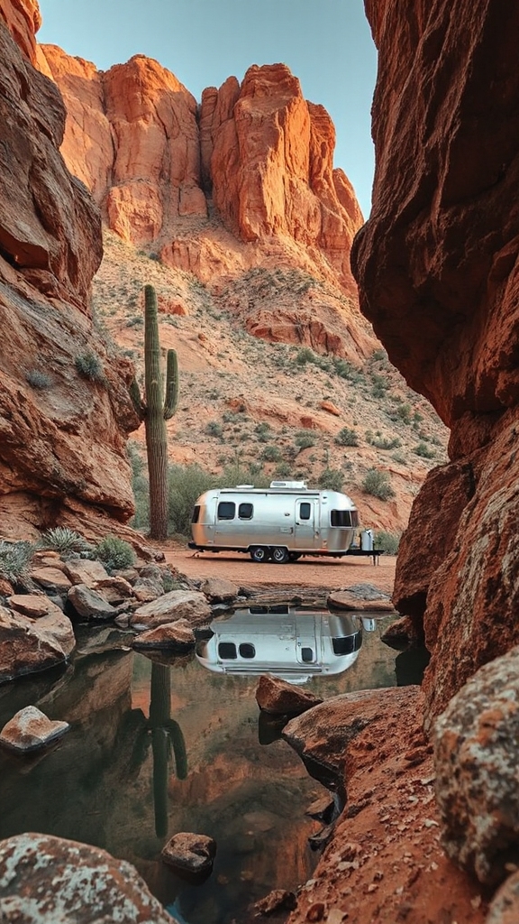 You’ll need to utilize natural formations, like canyons and rock outcroppings, to your advantage. Position your rig in the shadows of these features during peak heat, and time your travel for early mornings or late afternoons when the sun’s less intense.