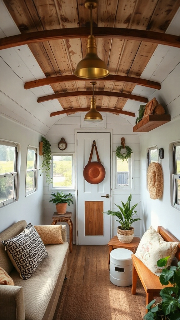 Faux shiplap offers a budget-friendly, lightweight alternative to real wood, while strategically placed reclaimed beams add character without compromising your RV’s weight restrictions.