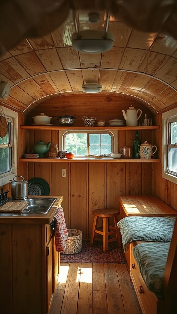 Rustic open shelving brings character and functionality to vintage camper interiors while maximizing limited wall space.