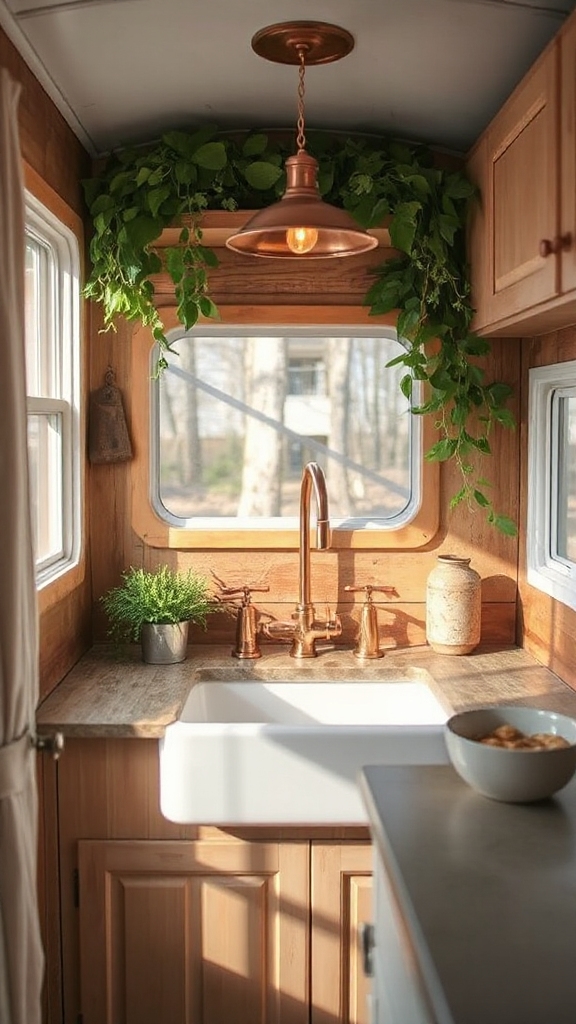 A copper farmhouse sink anchors your vintage camper’s kitchen with timeless elegance and practical functionality.